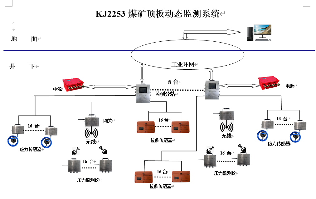 系統(tǒng)由工控機主機、打印機、KJ2253-F礦用本安型監(jiān)測分站、KJ2253-W礦用本安型網(wǎng)關、GMY500礦用本安型錨桿(索)應力傳感器、GUD1000礦用本安型位移傳感器、YHY60礦用本安型壓力監(jiān)測儀、FYF5礦用本安型紅外遙控器、礦用隔爆兼本安型直流穩(wěn)壓電源及MHYV1×4(7/0.43mm)煤礦用聚乙烯絕緣聚氯乙烯護套通信電纜等設備組成。
